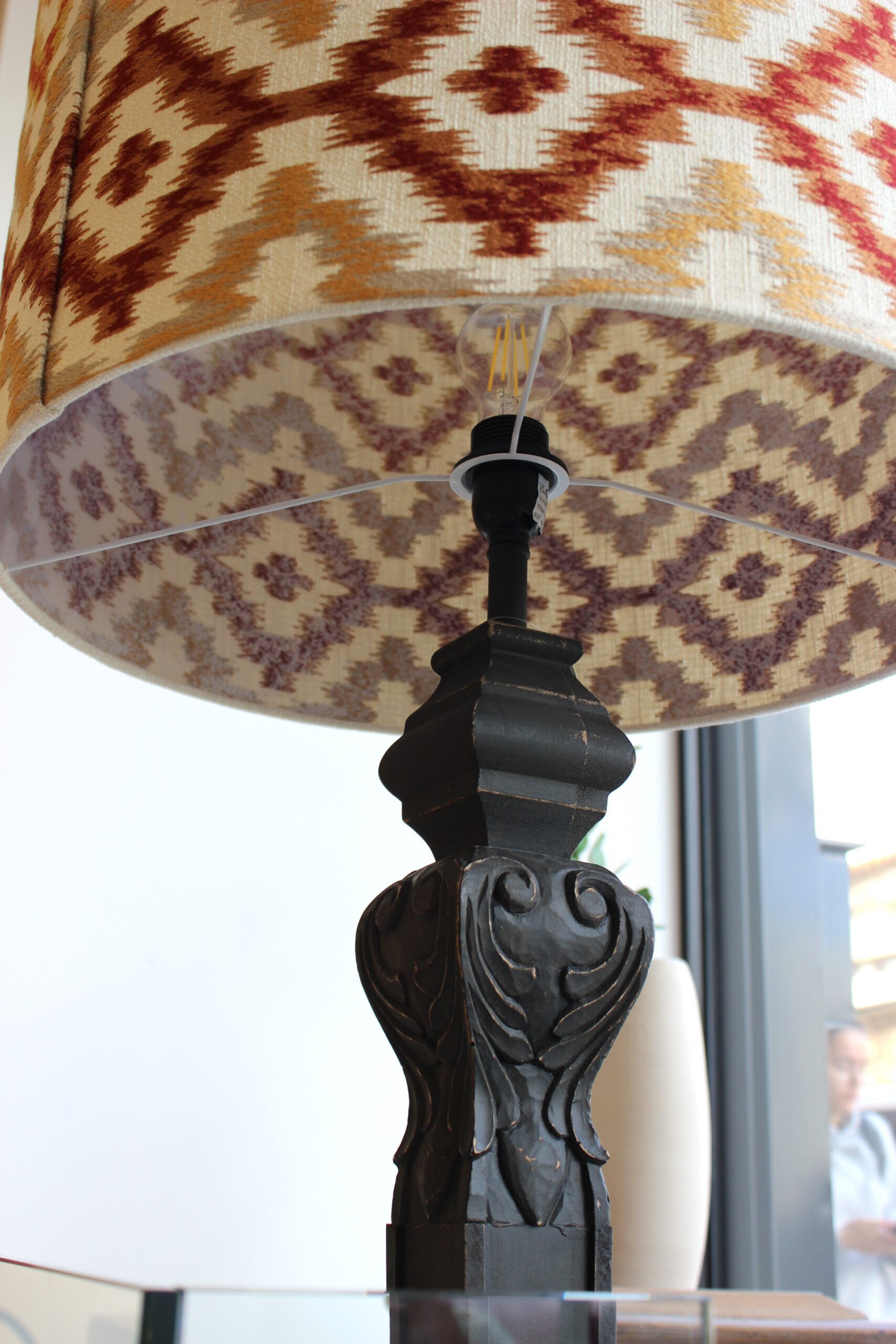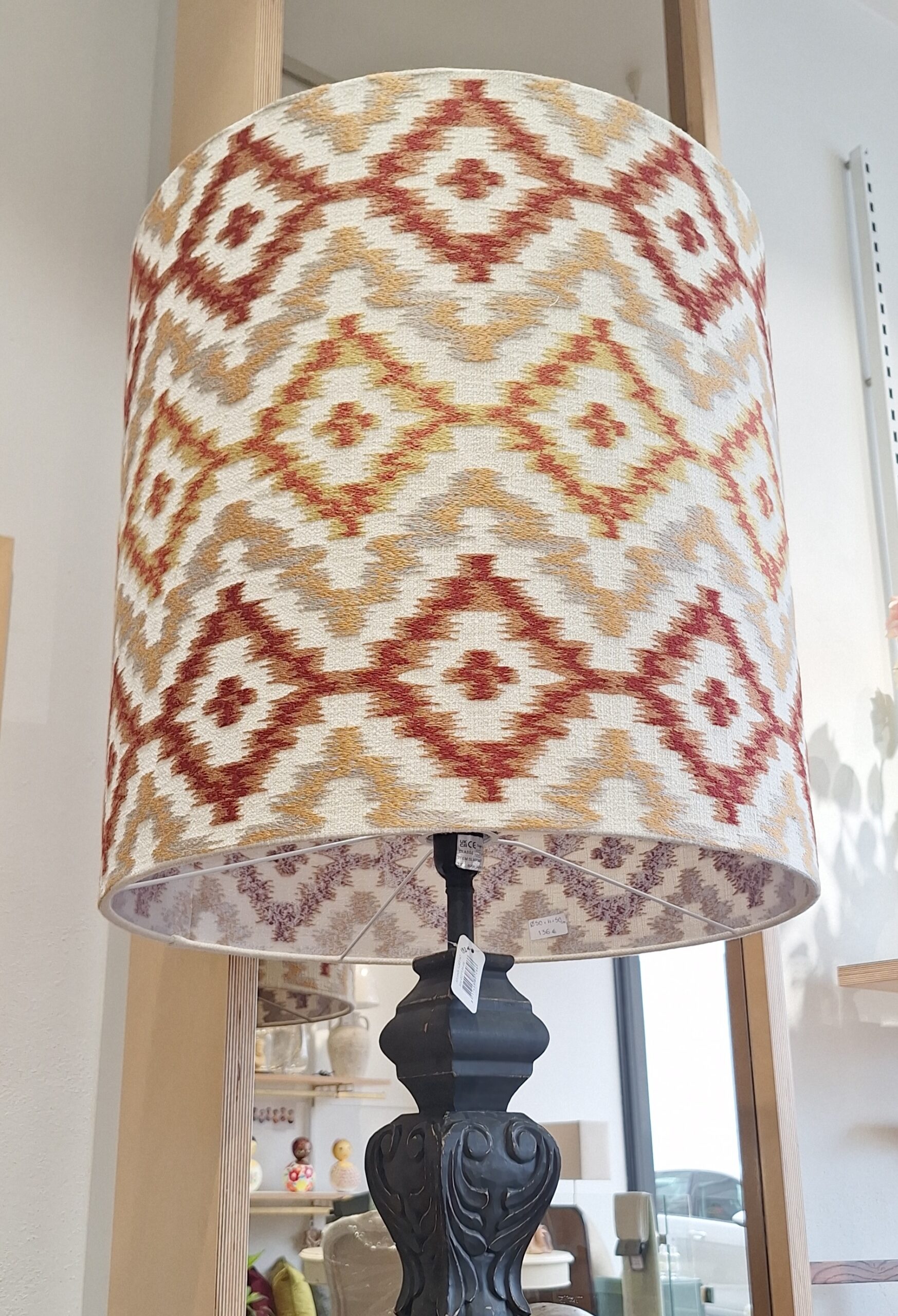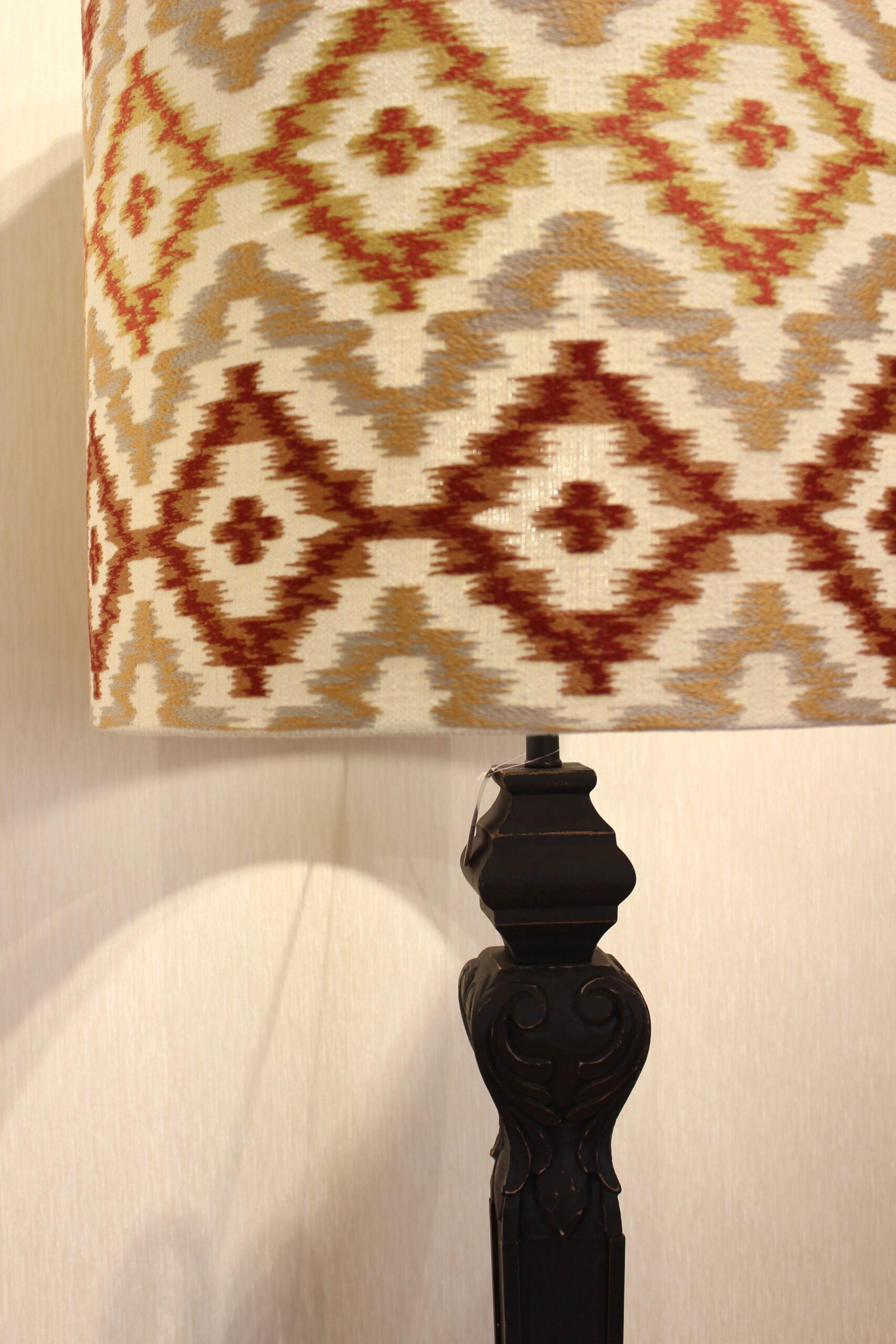 Abajur de design muito marcante e acolhedor, em tecido com padrão geométrico inspirado em motivos étnicos/tribais.