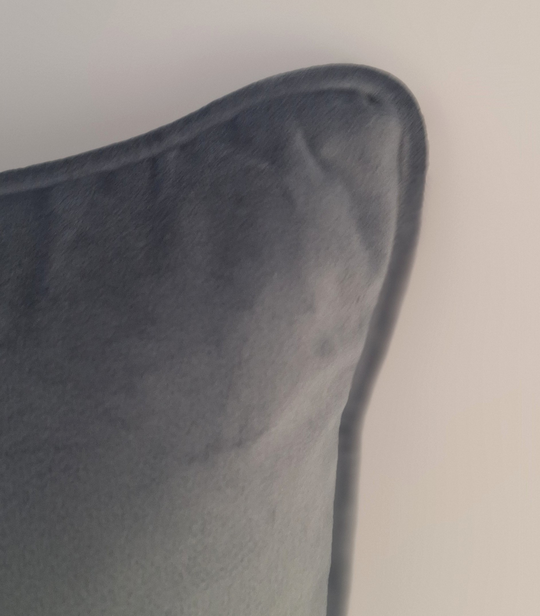 Almofadas em veludo bordeaux, cinza e mostarda, rematadas com vivo — o detalhe que eleva o conforto e dá personalidade ao seu espaço.