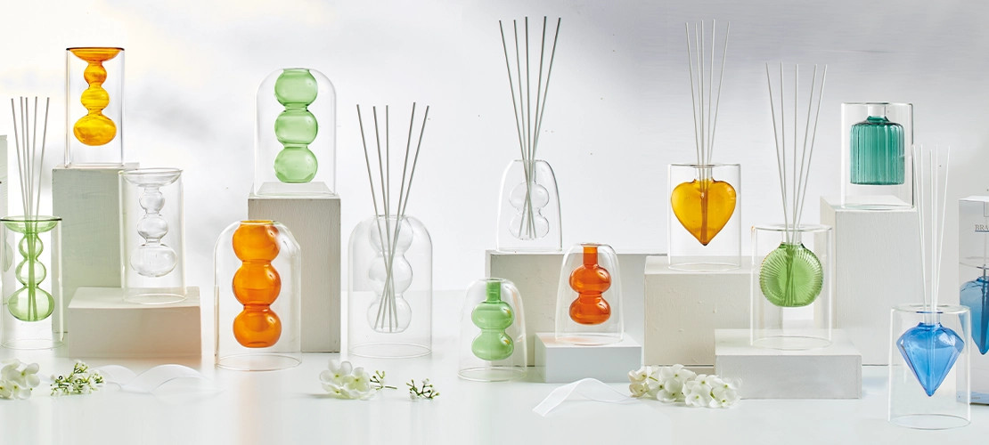 Projetado para realçar qualquer contexto, a nova linha de difusores fragâncias consiste num elegante frasco de vidro transparente no qual se destacam formas detalhadas no interior, disponíveis em várias cores.