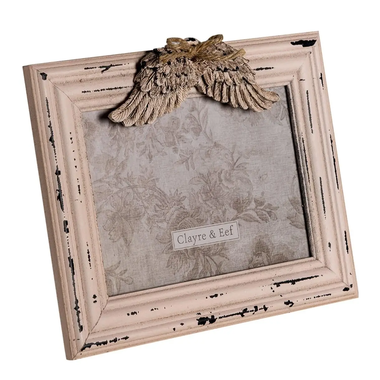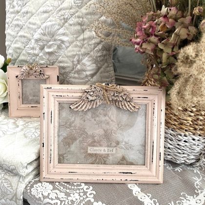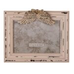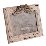 Moldura decorativa em madeira, com acabamento patinado e detalhe superior em forma de asas douradas. Um toque de elegância vintage que valoriza as suas memórias mais queridas. Ideal para ambientes românticos, clássicos ou shabby chic, onde cada pormenor conta uma história.